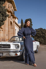 The 'Everything in Time' is a modern take on vintage inspired luxury. This dress is not short of intricate details. The subtle navy polka dots along with its pleated skirt detail add an extra character to the classy silhouette. It is a dress designed to transcend seasons and speak volumes on it is own. Pair it with a simple nude heels and you are ready to go!